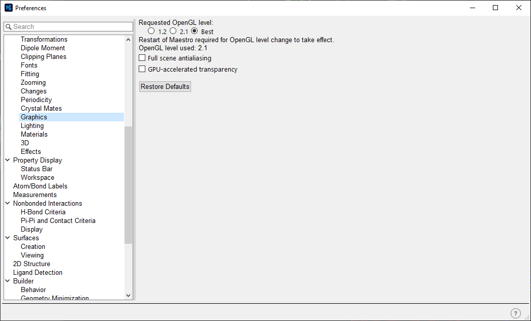 - In the left list select “Graphics”, set “OpenGL Level” to “Best” and uncheck “Full scene Antialiasing” and uncheck “GPU-accelerated transparency”.
